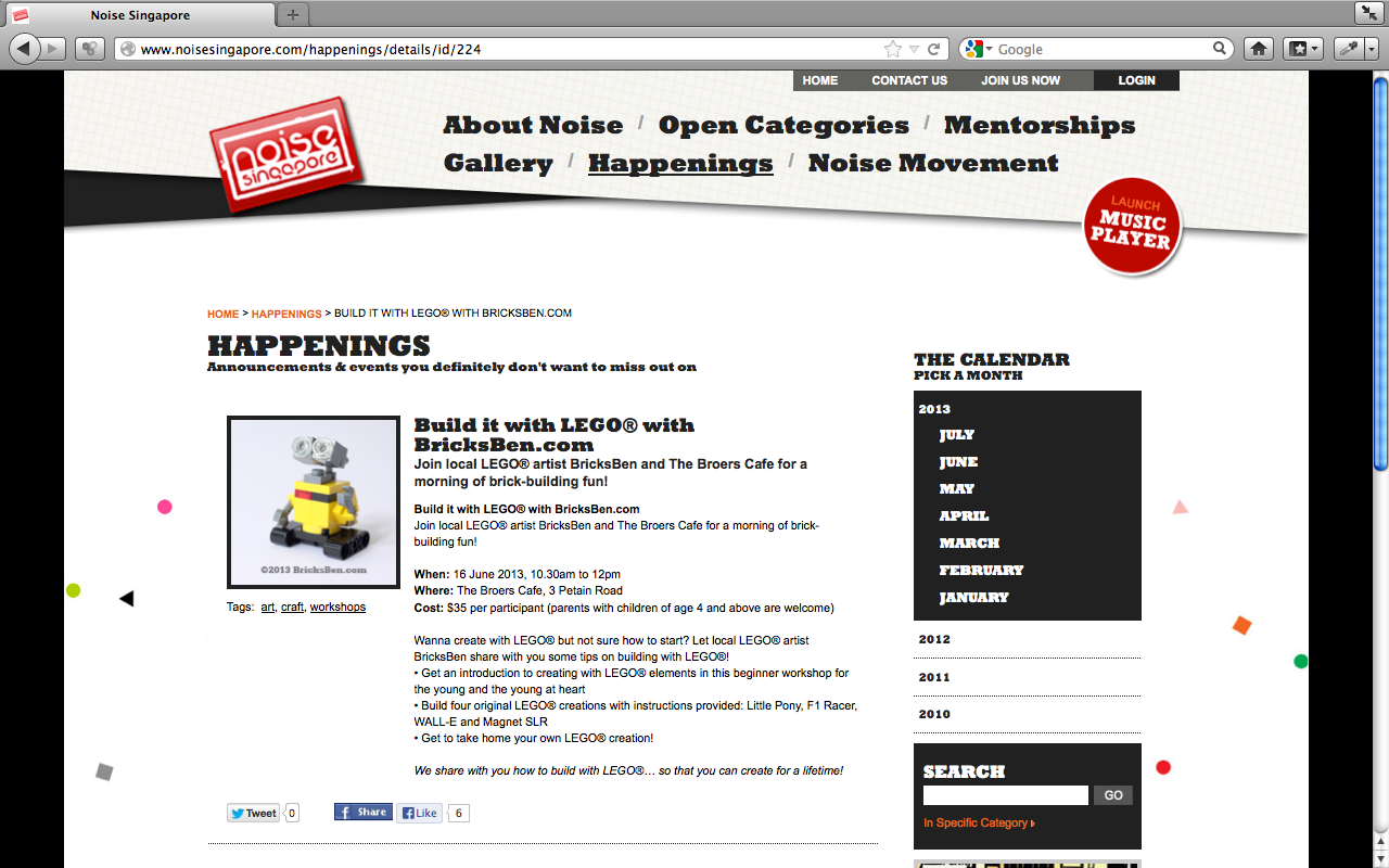We’re part of Noise Singapore! The National Arts Council has selected BricksBen to showcase our LEGO® creations at the Pop-Up Noise Showcase at Raffles City Singapore from 15 to 24 March 2013 – check it out here, here and here.